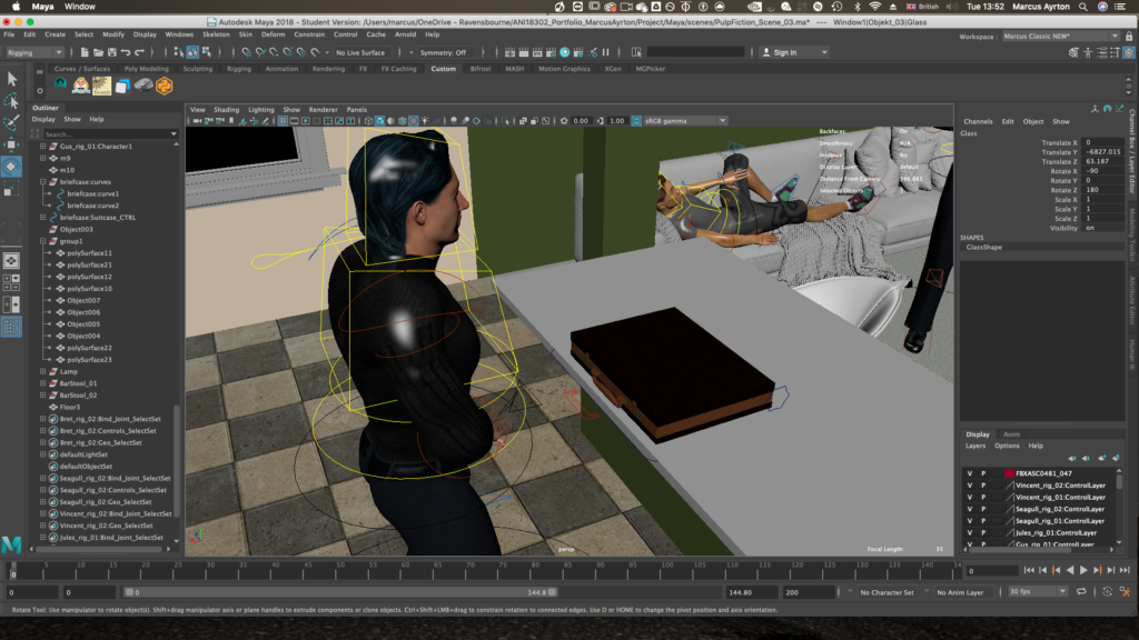 Primarily in this build, I used a lot of premade assets sourced from “Turbo Squid”, and built up the scene using reference images of the film. I imported one of the characters to define the scale. I also found a suitcase rig which is really cool and the opening of it is very realistic. The walls, cupboards, and other specific room shapes I quickly modeled myself. I’m used to modeling a lot of scenery by hand myself, but being fully aware of how things like advanced chairs, loungers, sofas, and fridges take to model in detail, quickly getting some free ones was much easier. I then populated the scene with posed characters so from this point I could understand the 3D space that I had created.