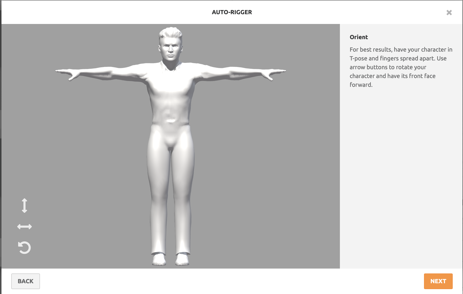 Here is the Mixamo interface. After importing the character you get a preview of the character mesh which you can then view pre-made motion-captured animation, or a T pose to download the character in the fixed position (with the mixamo skeleton structure)